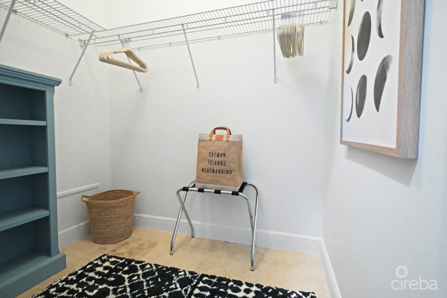 The Master Suite offers a tranquil retreat with a queen bedroom set opening onto a private deck featuring poolside and oceanfront views. The spa-inspired en-suite bathroom includes double vanity sinks, an oversized travertine shower with a teak bench, a soaking jet tub, a private water closet, and a spacious walk-in closet. The second bedroom serves as a flexible guest suite with a queen bed, a walk-in closet, and ensuite bathroom.