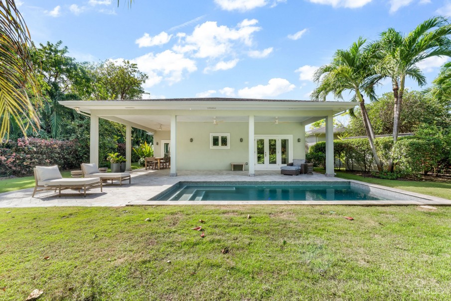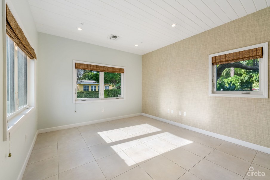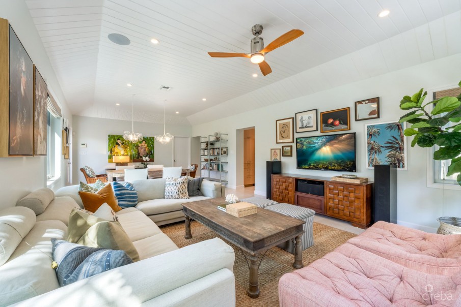 Designer-renovated residence by Lydia Uzzell Interior Design on a 0.30-acre lot with swimming pool, mature landscaping, and two separate buildings—ideal for multi-generational living, home + office, or rental income. The main home offers 3 bedrooms, 2 bathrooms, an open-plan living and kitchen, and a 528 sq ft covered rear porch. The second building includes 2 bedrooms, 1 bathroom, and a kitchenette, perfect for guests or independent rental use. Previously rented long-term at USD $11,000/month, with strong potential for short-term rental optimization. Approx. 2,704 sq ft total, including porch. Features include marble countertops throughout, custom cabinetry by KW Woodwork, silver travertine patios and driveway, integrated 3-zone sound system, landscape lighting, hurricane-rated windows and doors, closed-cell foam roof insulation, two-zone A/C (main house recently replaced; cottage brand new), deep-well irrigation, full fencing, and mature fruit trees. Move-in ready and located in one of the most desirable residential areas south of George Town.
