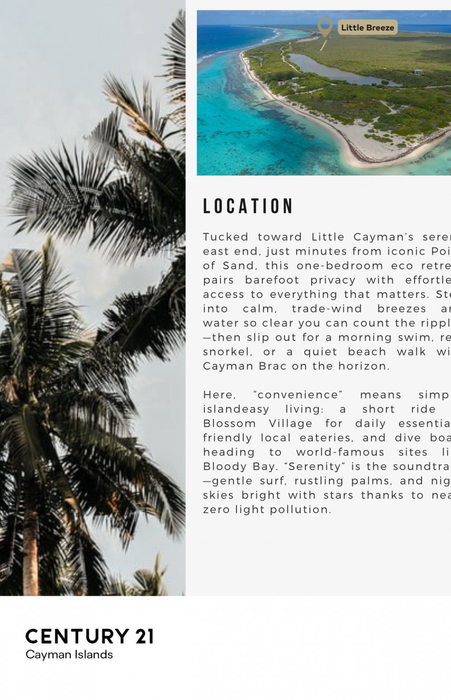 Own your own little piece of paradise in Little Cayman! Little Breeze packs a big punch sitting on .85 acre of beautiful ocean view property (photo taken off Lands and Survey). Pre construction allows for optimal pricing for this one bath, one bed island hide away. Green powered with solar and battery, your home will be extremely energy efficient. Contact us about Little Breeze today!