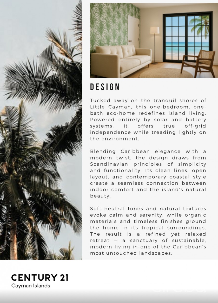 Own your own little piece of paradise in Little Cayman! Little Breeze packs a big punch sitting on .85 acre of beautiful ocean view property (photo taken off Lands and Survey). Pre construction allows for optimal pricing for this one bath, one bed island hide away. Green powered with solar and battery, your home will be extremely energy efficient. Contact us about Little Breeze today!