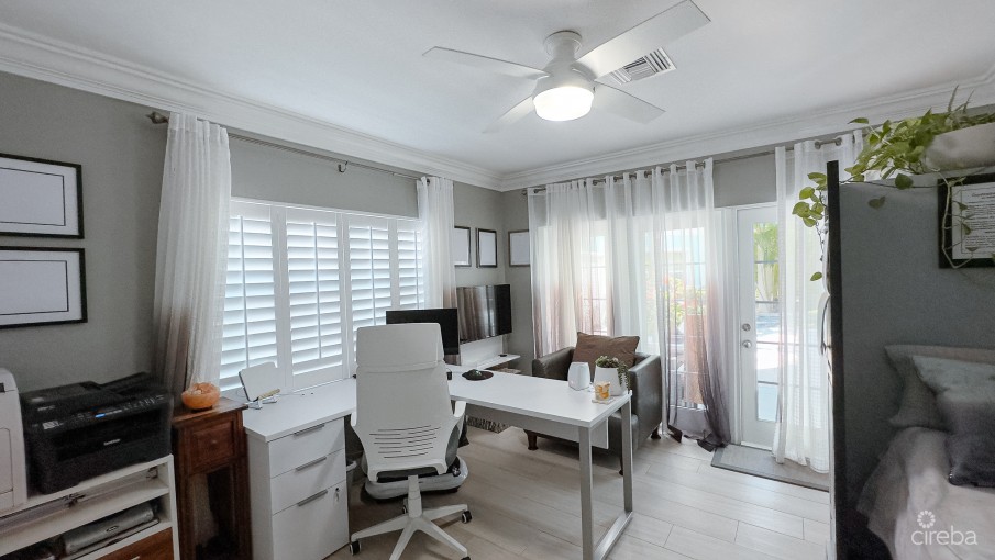 This townhouse offers the unique advantage of a dedicated home office setup. One of the bedrooms on the ground floor is designed as an office space, complete with its private patio, making it an ideal retreat for working from home.