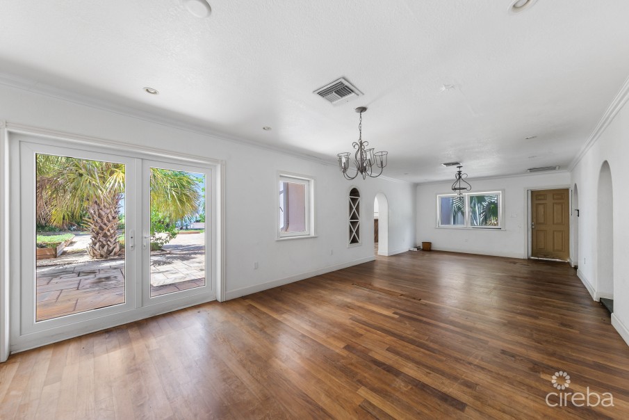PRICE NOW ADJUSTED TO UNDER RAW LAND VALUE! A rare opportunity to acquire an exceptional oceanfront property situated on over an acre of land overlooking the serene waters of South Sound. This expansive estate features a main residence, guest cottage, and separate apartment—offering incredible scope for renovation or redevelopment. Its Beach Resort Residential Zoning permits four storey redevelopment such as the adjacent Aura apartments. The nearby Harbour Walk and Grand Harbour Shoppes offer a wide array of retail outlets, a supermarket, pharmacy, medical services, vaious restaurants and bars and a 24/7 gym. With timeless charm and a stunning location, the property is ideal for those looking to create a bespoke private home or to redevelop with a strong upside. The existing structures offer a solid foundation for transformation, while the generous lot size provides ample space for expansion and redesign. Complete with a large pool, cabana, and breathtaking ocean views, this property represents a blank canvas in a sought-after setting. An exceptional opportunity not to be missed.