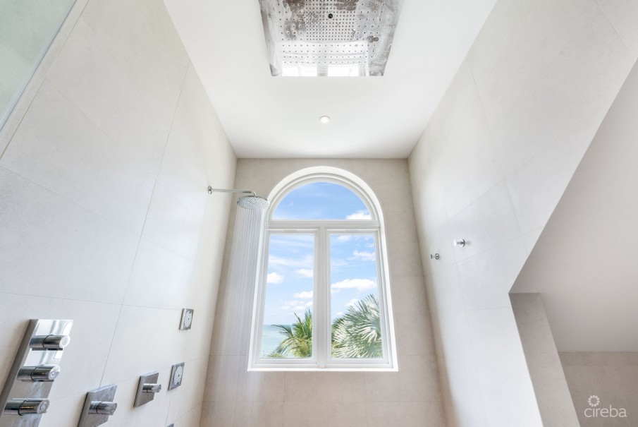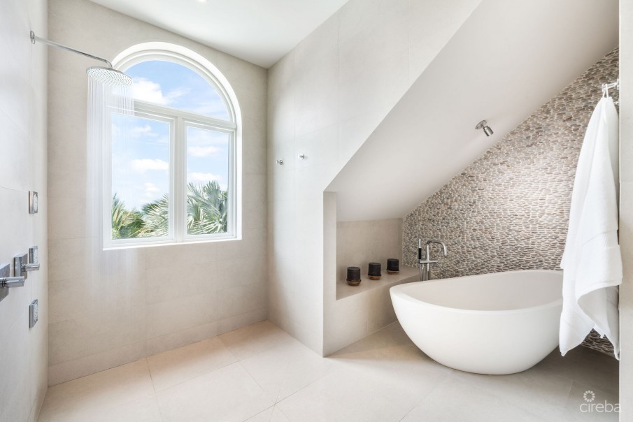 Upstairs, the second-floor features four en-suite bedrooms and a spacious den outfitted with an 85-inch Samsung TV and Sonos sound system, perfect for relaxing movie nights or gatherings. The master suite is a sanctuary unto itself, complete with a luxurious rain shower, a freestanding tub overlooking serene ocean vistas, and custom-designed finishes that enhance the atmosphere of sophistication. Warm engineered hardwood floors, curated art installations and a HVAC scenting system add a touch of timeless elegance throughout.