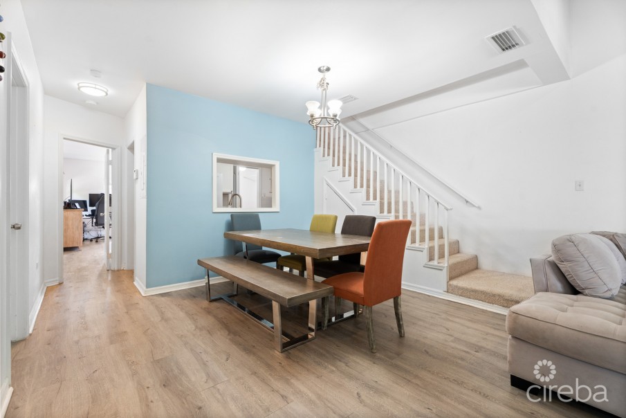 Superb location within a private gated complex on Walkers Road, close to schools, hospitals and GT central. This sort after unit makes for an ideal island home close to George Town with easy access to SMB areas. Master bedroom is ideally positioned on the ground floor level, along with kitchen, utilitiy room, lounge and screened patio and green fenced private garden. Second floor is an open Mezanine (den or office) which can be converted into a 4th bedroom, and then two large bedrooms with an adjoining bathroom. High ceilings throughout and tall windows giving ample natural light. Property has hurricane shutters , under stair storage, attic space. 2 parking spaces. Sold fully furnished. Pets allowed. Short walk to Smiths' Cove beach.