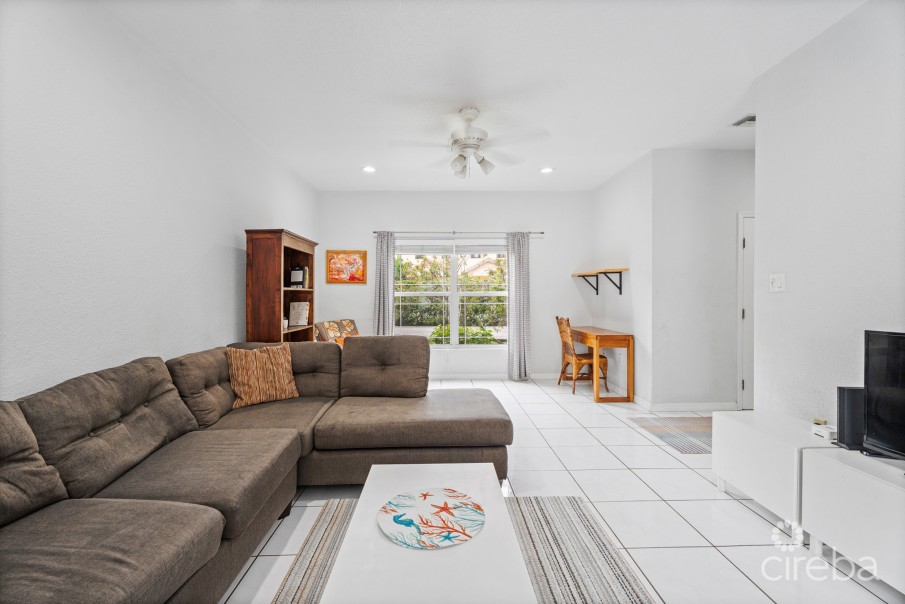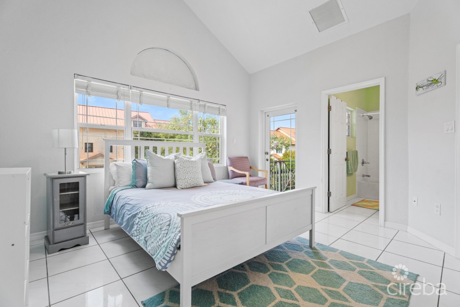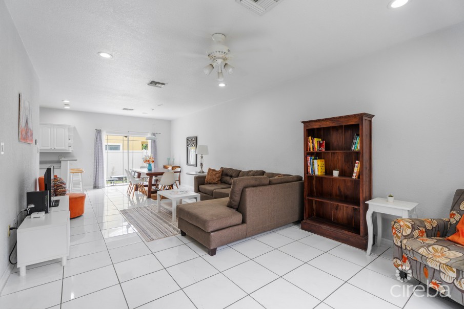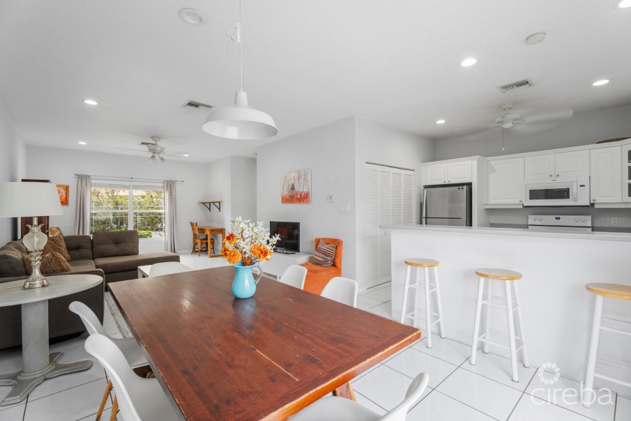 Located in the family-friendly Southern Skies community in South Sound, this spacious 2-bedroom, 2.5-bath townhouse offers comfortable island living in a prime residential location. The ground floor features a bright, open-plan layout with a functional kitchen, breakfast bar seating, and seamless flow into the dining and living areas—ideal for everyday living and entertaining. Sliding doors lead out to a private garden-view patio, providing a peaceful outdoor space to relax and unwind. Upstairs, both bedrooms are generously sized and include en-suite bathrooms, offering privacy and flexibility for owners, guests, or rental use. Neutral finishes, tiled floors throughout, and ample natural light create a clean, move-in-ready interior. Southern Skies is a pet-friendly complex with a swimming pool and on-site gym, conveniently located just minutes from the beach, George Town, schools, and amenities along South Sound Road. An excellent option for first-time buyers, professionals, or investors seeking a well-priced townhouse in a central, well-established community.