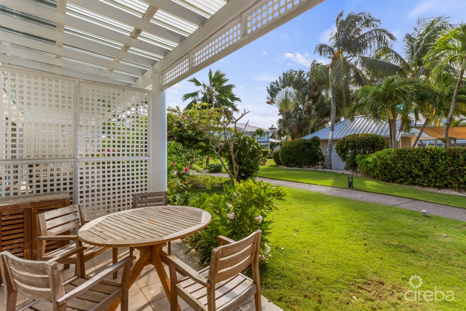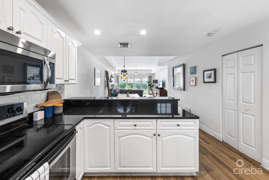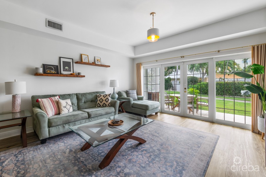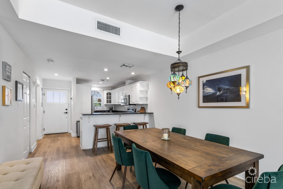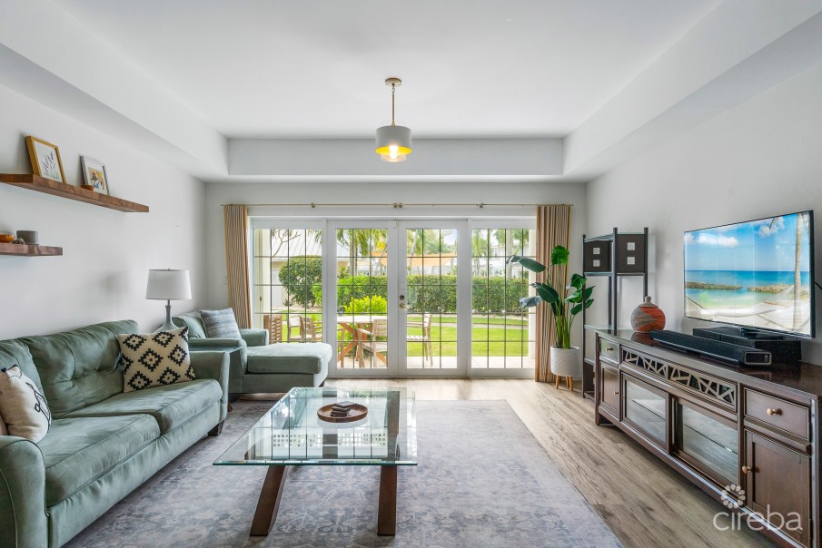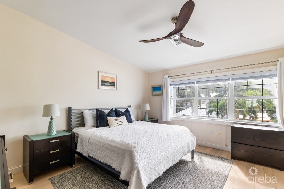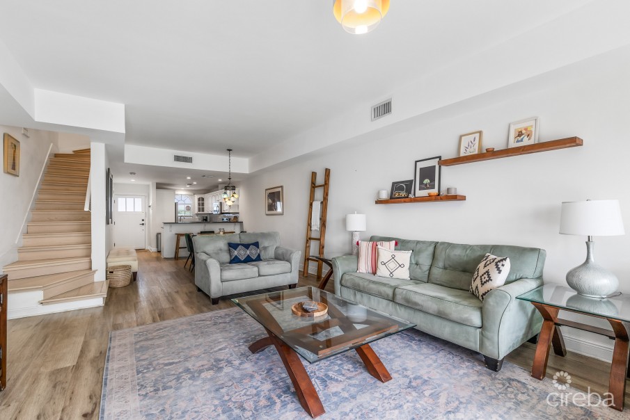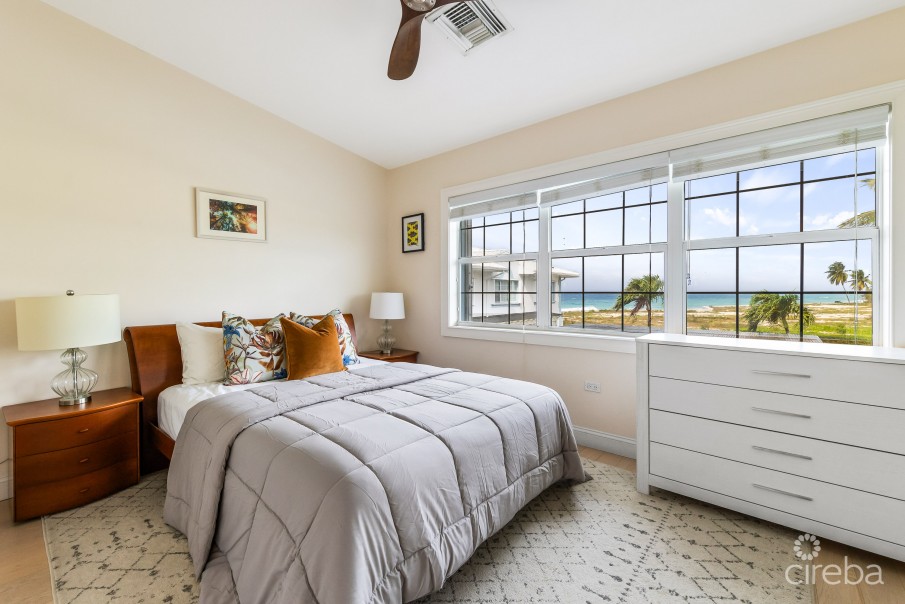 Gracefully set along the South Sound shoreline, Windsor Village offers a serene island retreat where the sea is always within reach. Framed by lush tropical landscaping and cooled by gentle ocean breezes, this intimate waterfront community captures the essence of relaxed coastal living. This beautifully presented townhouse spans 1,659 sq. ft. of bright, thoughtfully arranged living space, offering both privacy and a natural sense of calm. The ground floor is designed for effortless island living, with an open-plan layout that flows seamlessly from the living and dining areas onto a covered private patio—an inviting space for morning coffee, quiet afternoons, or evening unwinding while overlooking lush greenery. Upstairs, the primary suite enjoys ocean views and features a king-size bed along with a beautifully renovated bathroom complete with a bathtub and walk-in shower, while the second bedroom also offers ocean views. Tastefully furnished throughout, the home is perfectly suited for families or long-term residents seeking comfort, simplicity, and an unhurried coastal lifestyle. Residents of Windsor Village enjoy manicured tropical gardens, a beachfront swimming pool, and direct access to the shoreline. A private dock and cabana provide the perfect setting for paddleboarding, snorkeling, or simply relaxing by the water’s edge. Just minutes from Surfer’s Beach and Smith Cove, Windsor Village feels delightfully removed yet remains conveniently close to town—offering a rare blend of tranquility, natural beauty, and timeless South Sound living.