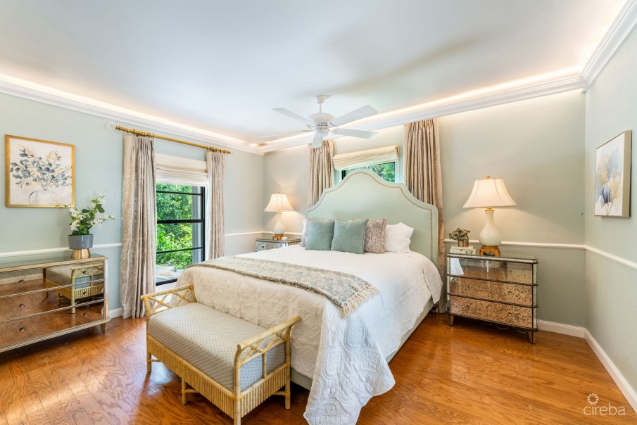 Welcome to this timeless colonial-style residence, tucked away in the desirable South Sound community of Pirate Cove Estate, directly across from the Cayman Islands Tennis Club. Combining character, charm, and modern comfort, this home offers a truly inviting retreat. Step inside to custom wood finishes, elegant arched windows framing lush garden views, and thoughtfully designed living spaces. The main floor features a formal dining room, a comfortable living room, and a den, alongside a separate kitchen and guest washroom. A cozy bar room adds extra character, making the home ideal for both relaxation and entertaining. Upstairs, the home provides a private and comfortable retreat. The primary suite includes a spacious walk-in closet, a double vanity, and a large walk-in shower, with direct access to a terrace overlooking the lush gardens below. Two additional bedrooms share a well-appointed bathroom—one opens onto the terrace through elegant French doors, while the other features a custom closet—creating a practical and inviting layout for family or guests. Outdoors, the property shines as a private sanctuary. The covered patio includes a bar, dining, and lounge area—perfect for gatherings—while the expansive 35-foot pool is surrounded by lush, mature gardens cultivated over 40 years. Fully furnished and move-in ready, this two-story home on nearly half an acre offers 4,100 sq. ft. of comfortable living in one of Grand Cayman’s most established neighbourhoods.