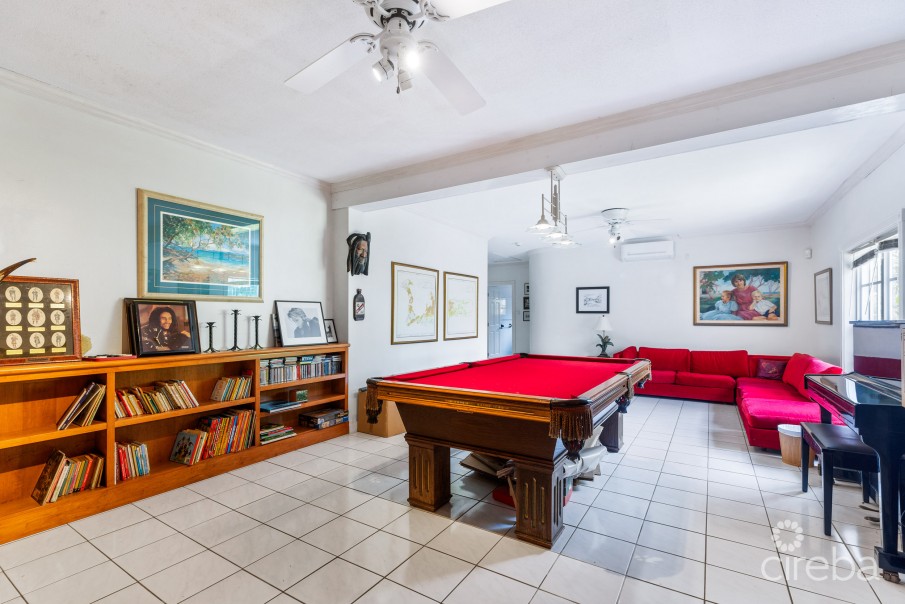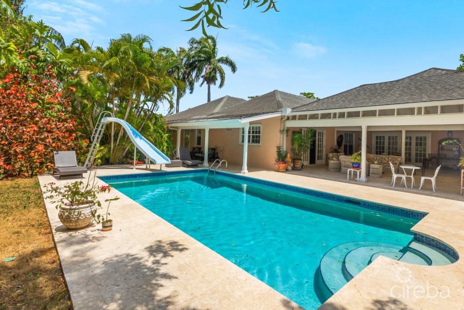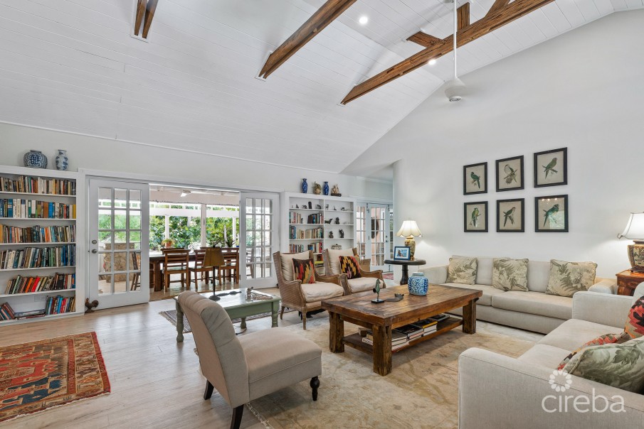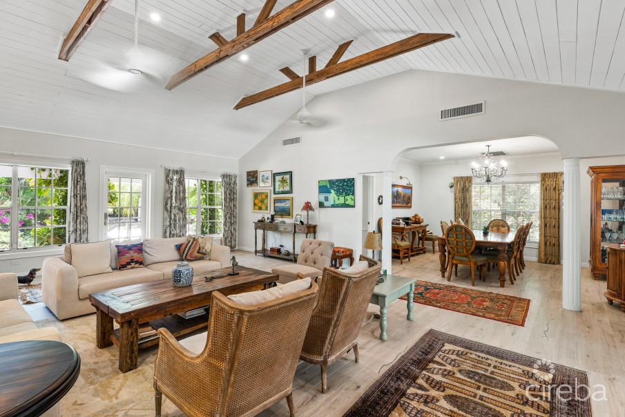 Nestled in the prestigious gated community of Webster's Estates in South Sound, this charming six bedroom family home sits secluded on a generous 1.09 acre land parcel boasting 8,718sf of accommodation split across two buildings. Driving through the white picket fence gates, this quintessential Caribbean home appears modest from the front however this is very deceiving once inside. The main home is located on a single story, maximizing use of space and ease of navigation. The front door enters in to the great room that instantly captures your attention with it's high ceilings, exposed timber rafters and views through the French door to the tranquility of the pool and garden. Conveniently access off this central living space is found the home office, dining room, kitchen and TV room. Combining traditional Caribbean architecture with modern upgrades to the floor and kitchen in recent years help viewers envision the opportunity that is found within this absolute gem. All six bedrooms are conveniently located on the ground floor in the North West wing of the home. The primary suite featuring spacious closet and en-suite flows beautiful to the covered lanai. The first of the guest bedrooms features access to the covered veranda, ample closet space and en-suite bathrooms. The additional four bedrooms located off the pool table and games room share a further three bathrooms. Stepping out the back kitchen door takes you to the separate John Doak designed building featuring two car garage and executive colonial style home office complete with kitchenette and half bath. This would easily be converted in to a 1 bed apartment for those that require living in help. The property is aptly named after its century-old mango tree, around which a lush garden thrives, complete with tropical plants, and expansive sitting areas. The large pool, shaded verandas and outdoor bar enhance the external living space, complemented by the gentle sound of breeze and soft sunlight filtering through the trees. Located in the family friendly community of Webster Estates and walking distance to Smith Cove beach, this expansive home ensures privacy and exclusivity. The Difference - The Old Mango Tree House isn’t just a home - it’s a lifestyle legacy for harmonious living. For an exclusive tour and a chance to experience the magic of this property, contact us today.