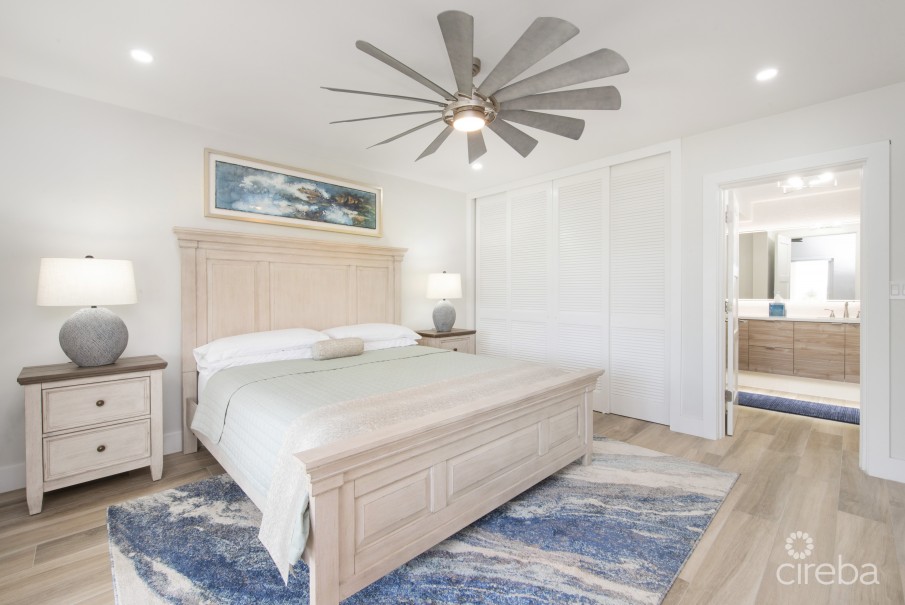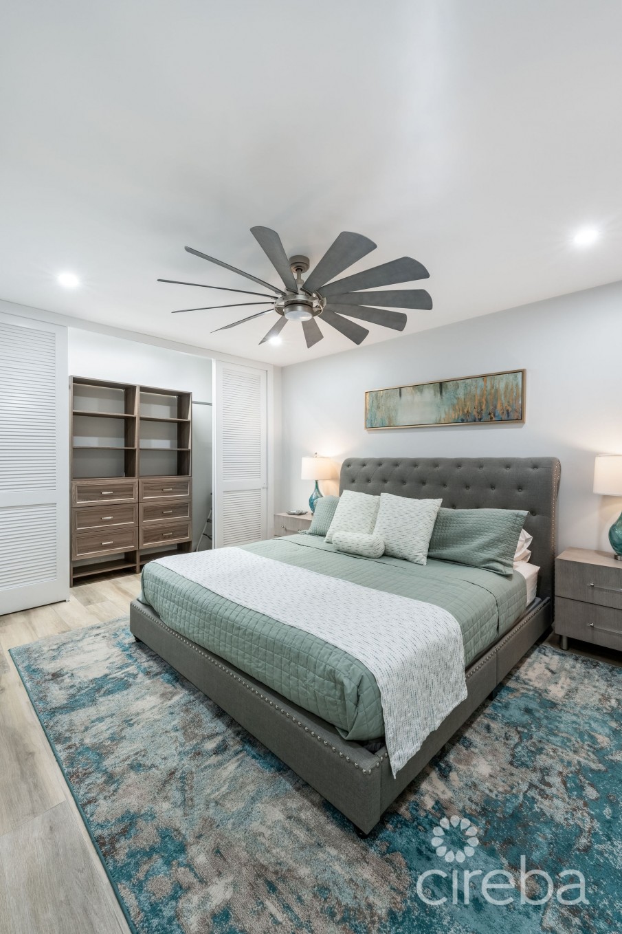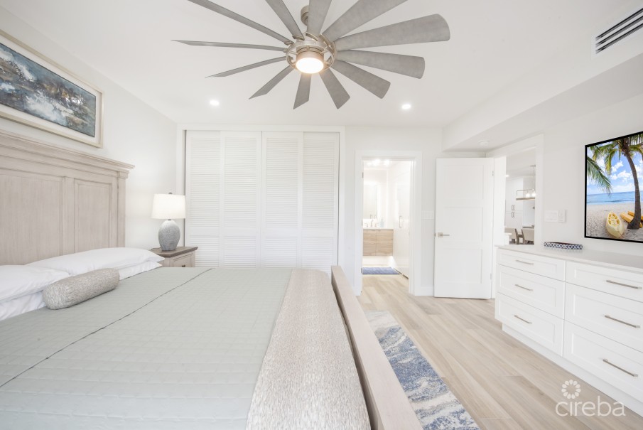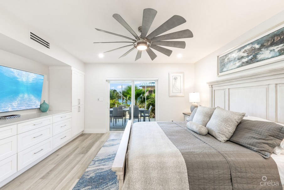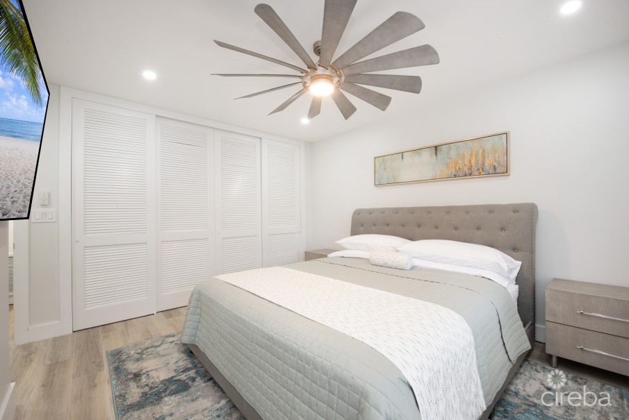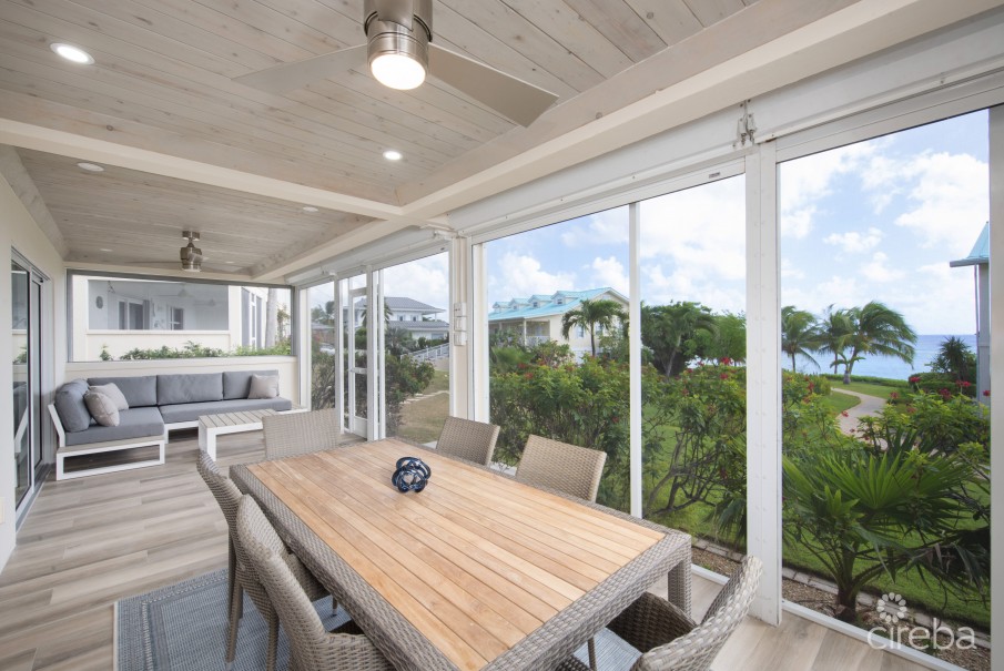 Step into luxury with this fully renovated, ground-floor, walk-out, end-cap positioned beach condo where coastal living meets refined elegance to offer an unparalleled Grand Cayman experience. This contractor's personal unit is a true gem, offering ocean views from the moment you cross the threshold. The contemporary, open-concept design is bathed in natural light and decorated in soothing sand and sea hues, creating a seamless connection between the indoors and the stunning surroundings. From the moment you walk through the front door you'll be captivated by picturesque ocean views, setting the tone for the entire space. Designed for the culinary enthusiast, the chef's kitchen is a true standout and features a full-slab prep and entertainment island with dine-in seating, generous storage, built-in wall ovens, a separate under counter icemaker, and a premium appliance package that's sure to impress. The stunning glass and LED-lit entertainment bar with wine/beverage center is ideal for cocktail parties and intimate gatherings. The primary suite is an ocean-view sanctuary designed with custom millwork and a chic, contemporary coastal palette. The luxurious en-suite bath offers a large double vanity, an LED lit mirror, under-cabinet lighting, and a generous barn door glass walk-in shower - creating a spa-like atmosphere that invites relaxation. The second King suite continues the coastal theme and offers a spacious, serene escape complete with a large vanity and decorator tiles in gorgeous sea hues of blue. With generously sized bedrooms and abundant storage throughout, this condo offers the perfect balance of comfort and convenience. The 280 square foot screened lanai is a breathtaking extension of the living space, offering a serene beach view that's perfect for dining al fresco with seating for six or unwinding in the comfortable lounge area. Whether you're hosting friends or enjoying peaceful solitude, this outdoor retreat with its stunning beach backdrop is the ideal setting for relaxation. Step out from the rear patio onto a charming sea-view path that leads directly to Cayman's beloved Spotts Beach. Here, a secluded powder-sand beach, shaded by palm trees and home to resident sea turtles, provides a peaceful, private escape. For additional enjoyment, residents can take advantage of the recently resurfaced private tennis court and the large freshwater communal swimming pool. With a dedicated parking space just steps away, convenience and tranquility blend perfectly in this extraordinary coastal oasis. Ideal as a popular in-demand vacation rental or as a private beach residential Haven.