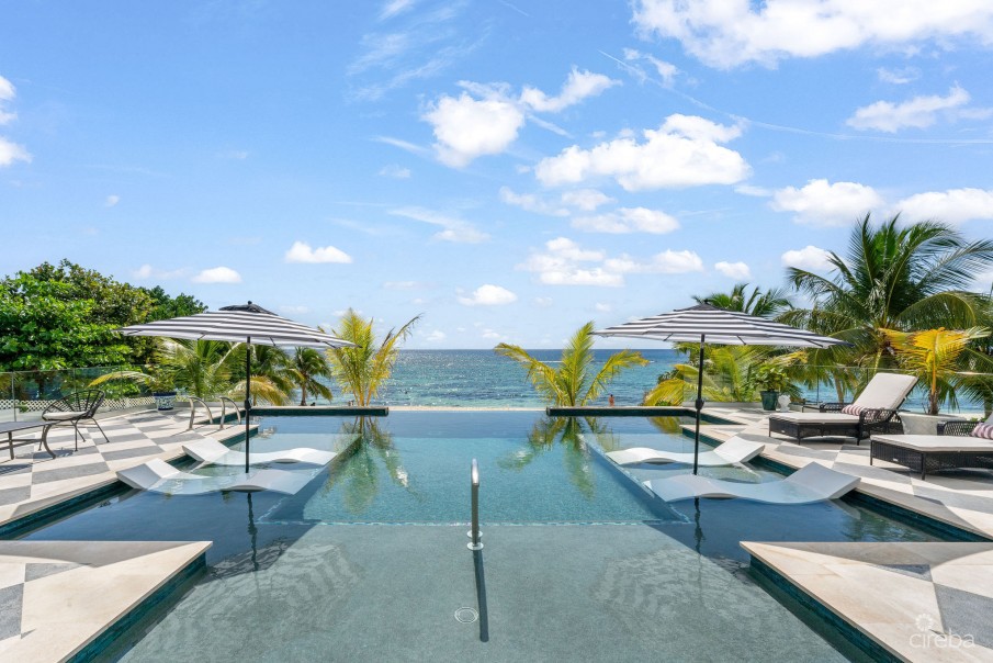 Step outside and discover four covered patios, inviting you to savor the gentle sea breeze and stunning views. And for those seeking refreshment, a heated saltwater pool with an infinity edge beckons. The cottage is graced with stone imported from Egypt, adding a touch of exotic flair to the design.