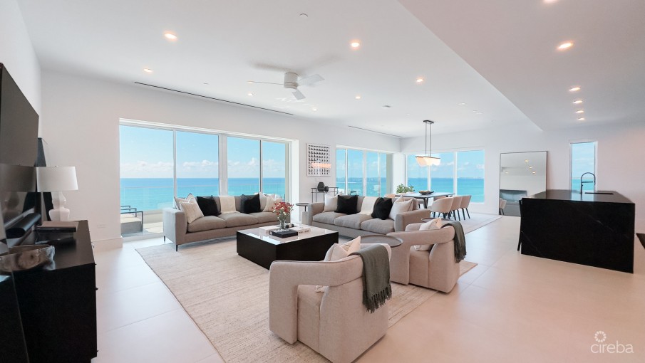 Discover one of Cayman’s most exceptional and distinctive new residences at Aqua. Sold fully furnished by one of the island's top interior design firms. Occupying the entire 7th floor, with 360-degree panoramic views, this residence boasts an impressive 50-foot-wide beachfront terrace, offering ample space for entertaining and dining while enjoying the breathtaking views of Seven Mile Beach and its stunning sunsets. Inside, the contemporary design and expansive living areas are flooded with natural light, thanks to floor-to-ceiling windows in nearly every room. The residence is finished to the highest standards, featuring custom cabinetry, a gourmet kitchen equipped with Miele and Sub-Zero appliances, Caesarstone quartz countertops, and rich natural stone and timber accents. Additional highlights include a spacious terrace on the sunrise side, accessible from two of the back bedrooms, as well as separate laundry and storage areas, a private office, and an elevator that opens directly into the residence. Situated in the heart of Seven Mile Beach, Aqua is just a 5-minute drive from both central George Town and Camana Bay. With schools, supermarkets, banks, doctor’s offices, restaurants, bars, and shops all within easy reach, everything you need is conveniently close by. With a dedicated concierge and security team, owners will enjoy a secure and seamless living experience, making this one of the most prestigious and valuable properties on Seven Mile Beach. Get in touch today! *Monthly maintenance and insurance costs are subject to fluctuation and changes.*