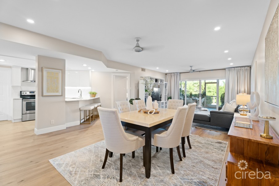 Step into this fully renovated 2-bedroom, 2-bathroom ground-floor residence at Regents Court, Britannia, offering 1,738 sq. ft. of open, inviting living space. The updated kitchen, dining, and living areas flow naturally to a screened-in patio overlooking the canal, creating an ideal spot for relaxing or entertaining. A private dock provides direct water access for boating or kayaking, and allocated parking ensures daily ease. Residents enjoy 24-hour security and access to a large swimming pool, hot tub, BBQ area, and meticulously landscaped grounds. Just a short walk from Seven Mile Beach, schools, and Camana Bay, this home offers both lifestyle and accessibility. With turnkey updates and a prime location, this residence is perfect for families, professionals, or as a rental investment.