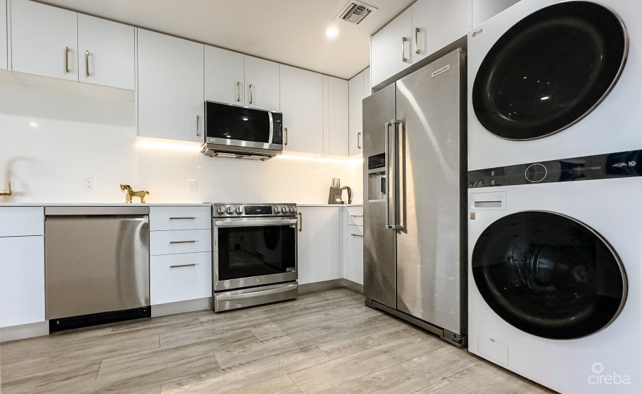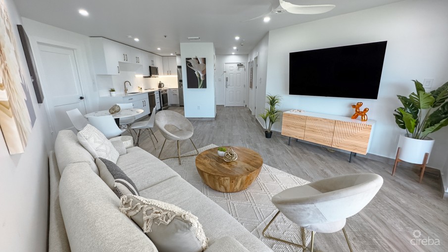 Located in the boutique Grand Caymanian Hotel, this penthouse seamlessly blends the comforts of a private residence with the conveniences of a world-class resort. Enjoy two oversized bedrooms, both with chic contemporary ensuite bathrooms. Unwind in an open-plan, light-filled living space enhanced by LED recessed lighting, a modern white kitchen with gold accents, crisp white quartz waterfall countertops, and stainless-steel appliances.