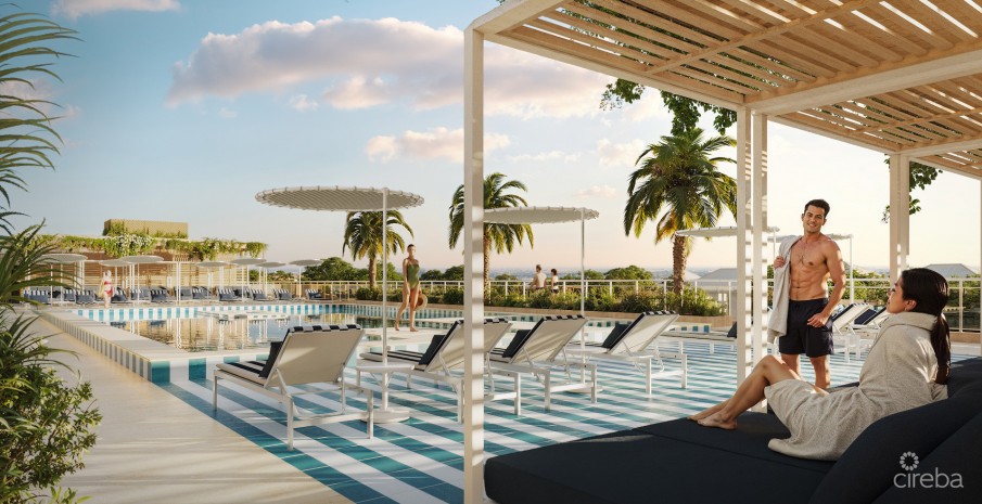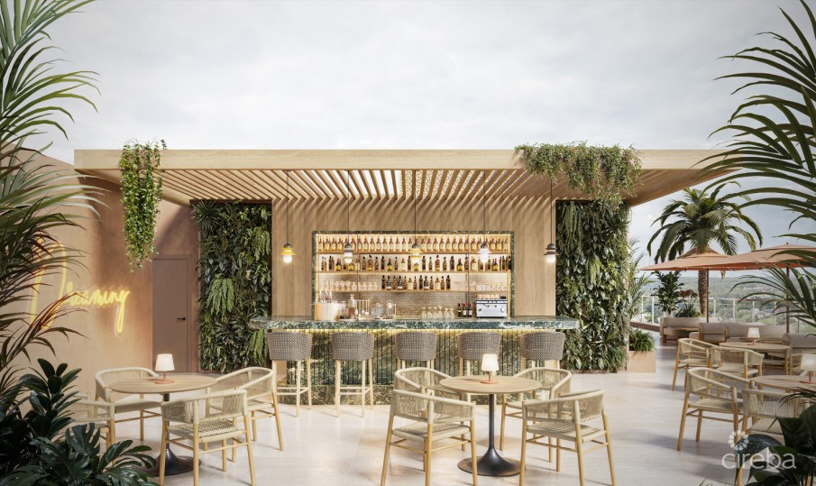 A defining feature is the private rooftop terrace, spanning the west building with sweeping views of the Caribbean Sea and North Sound. Here, residents enjoy a resort-style pool and hot tub, sauna and steam rooms, meditation garden, children’s play areas, social gathering spaces, and a rooftop bar, an amenity offering rarely found in boutique developments.