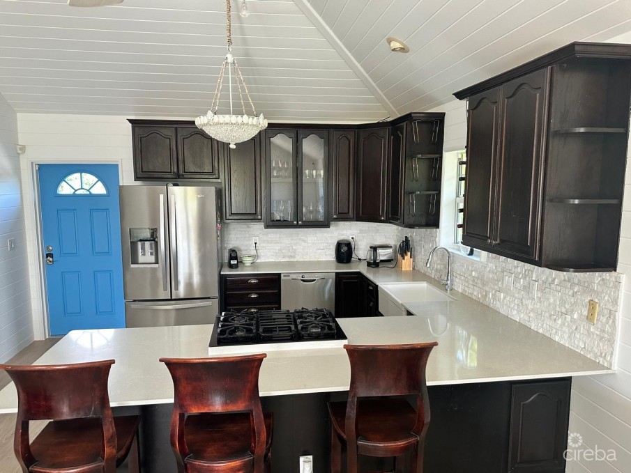 Renovated canal-front 4BR/3BA waterfront villa in charming West Bay offering 2,731 sq. ft. in a private 3-home community at the end of Uncle Bob Rd. Bright coastal interior with open-concept living and great indoor/outdoor flow—ideal as a full-time family home or a flexible investment for short-term vacation or long-term rental. Boater’s dream: canal sits at the mouth of the North Sound with quick access to Rum Point, Starfish Point & Stingray City, plus reinforced concrete seawall and dock service pedestals. Minutes to Calypso Grill and Tukka West.