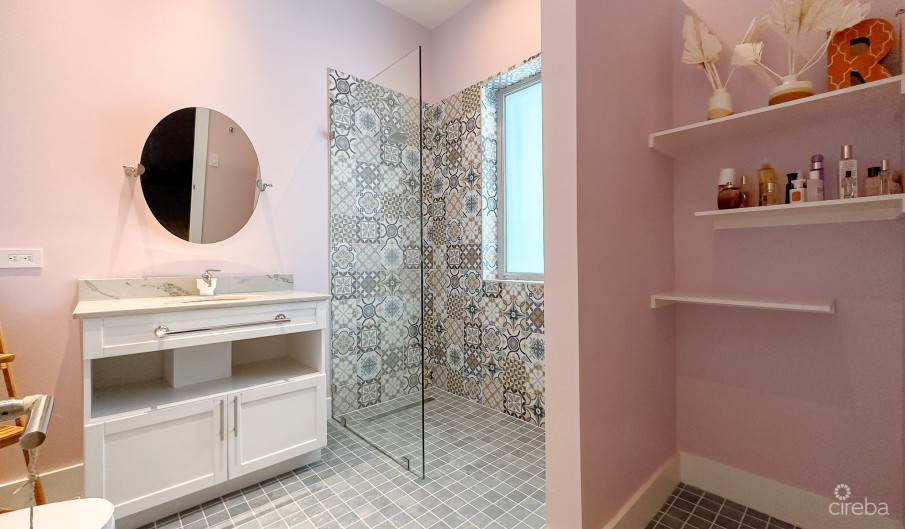 A lush, tropical sanctuary planted with an assortment of native Cayman fruit trees, vibrant plants & flowers and a tranquil pool with an integrated jacuzzi.