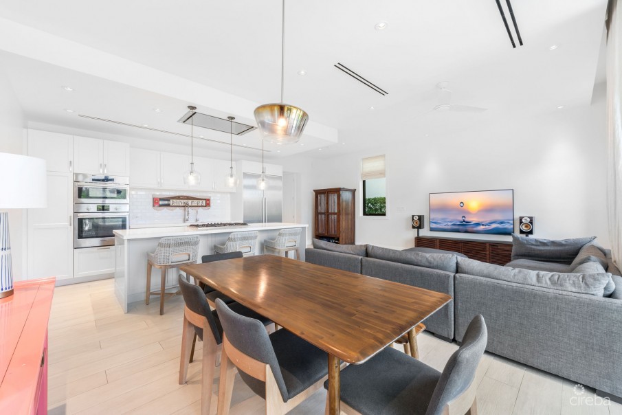 Olea Duplex 107 is a canal front residence located in the heart of the desirable community of Olea. Developed by NCB and Dart, this residence blends modern design with Caribbean charm. The 2,970 sqft home features an open-plan living and dining area, three bedrooms, and 3.5 bathrooms. The layout maximizes space and functionality with high ceilings and large patio doors leading to a private terrace and garden. The kitchen, perfect for entertaining, includes an oversized island, breakfast bar seating, Bosch appliances, quartz countertops, and custom cabinetry. Step outside to your private pool and garden area where you can spend the perfect weekend entertaining friends & family. Upstairs, each of the three well-proportioned bedrooms has its own ensuite bathroom, along with a large laundry room. The master suite has a balcony, perfect for morning coffee with the north sound breezes, overlooking the canal. Olea offers resort-style amenities such as a tropical swimming pool with a lazy river, fitness center, herb garden, yoga space, and communal BBQ area. This sustainable development includes geothermal cooling, solar panels, and electric car charging stations to minimize its carbon footprint. Conveniently located near the Camana Bay Town center, Olea 107 provides easy access to the island's central hub for shopping, dining, entertainment, fitness facilities, and health & wellness. The new Health City facility is nearby, offering state-of-the-art medical care. The community is walkable and connected, just a 10-minute walk from Seven Mile Beach and a short stroll from all of Camana Bay's attractions. This is the real difference.